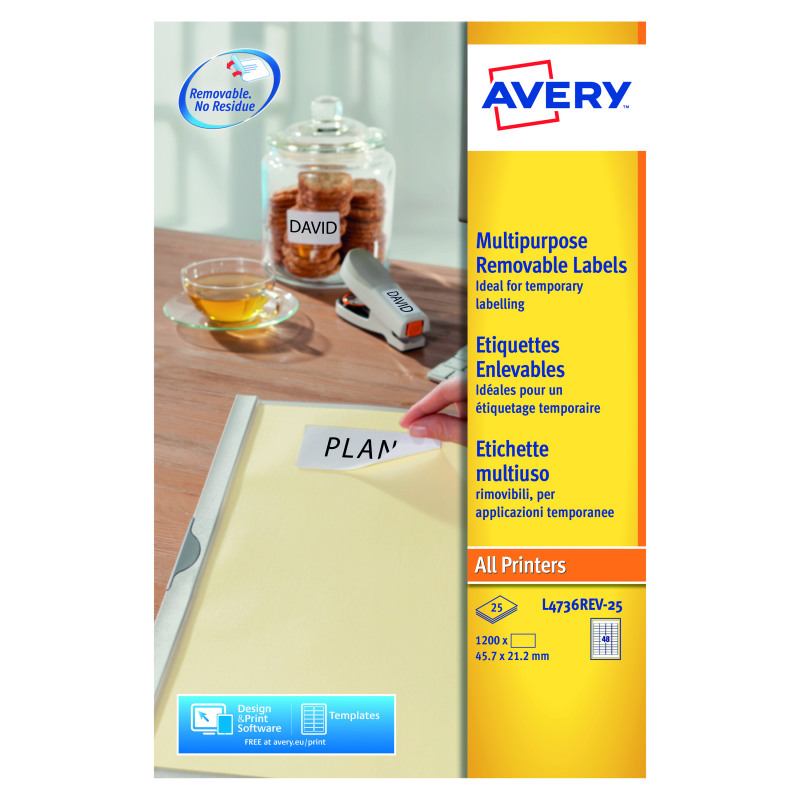 These Avery removable labels stick securely to almost any surface and can be removed or repositioned without leaving sticky residue. The Jam Free technology has been developed for these labels to optimise them for smooth, uninterrupted use with your laser printer. Try Avery's free software and templates to design professional looking labels. Made from fully recyclable paper, this pack contains 25 sheets with 48 labels per sheet (1200 labels in total).