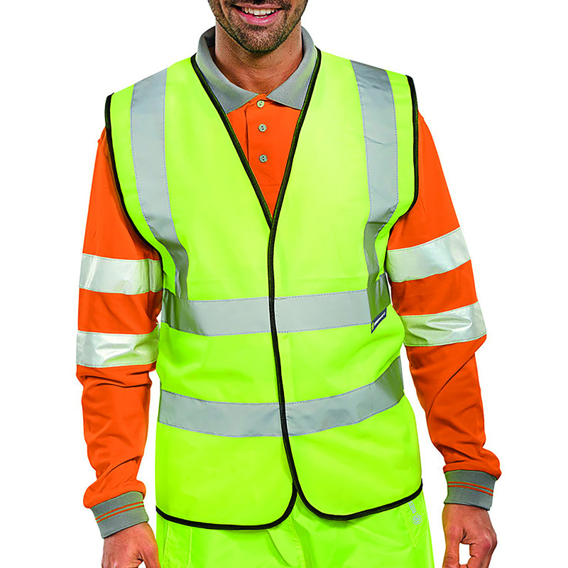 This High Visibility waistcoat is made from 100% polyester. It has retro-reflective tape for greater visibility and hook and loop fastening. Machine washable at 40 degrees C up to a maximum of 25 wash cycles.