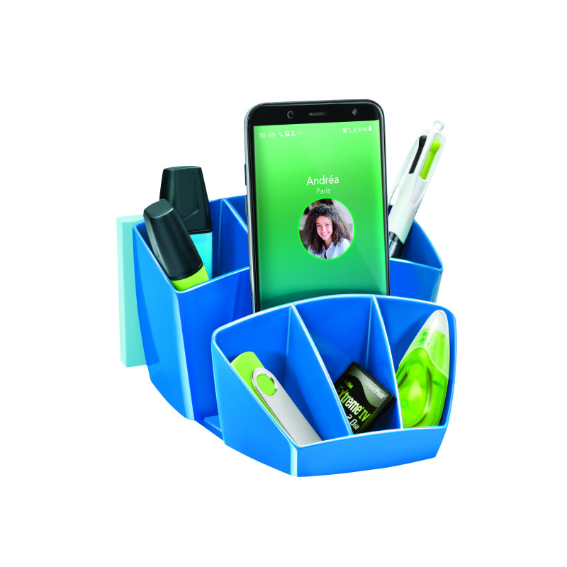 This CEP Pro Gloss desk tidy features 7 compartments for convenient storage of pens, highlighters, sticky notes, pins, scissors and more. Made from shock resistant, high impact polystyrene with a stylish, high gloss finish, the desk tidy also features anti-skid rubber feet for stability. This blue desk tidy measures W143 x D158 x H93mm.