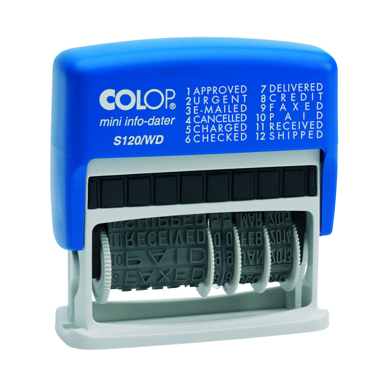 Self-inking dial-a-phrase date stamp. Incorporates 12 stock words/phrases along side a 4mm adjustable date.
