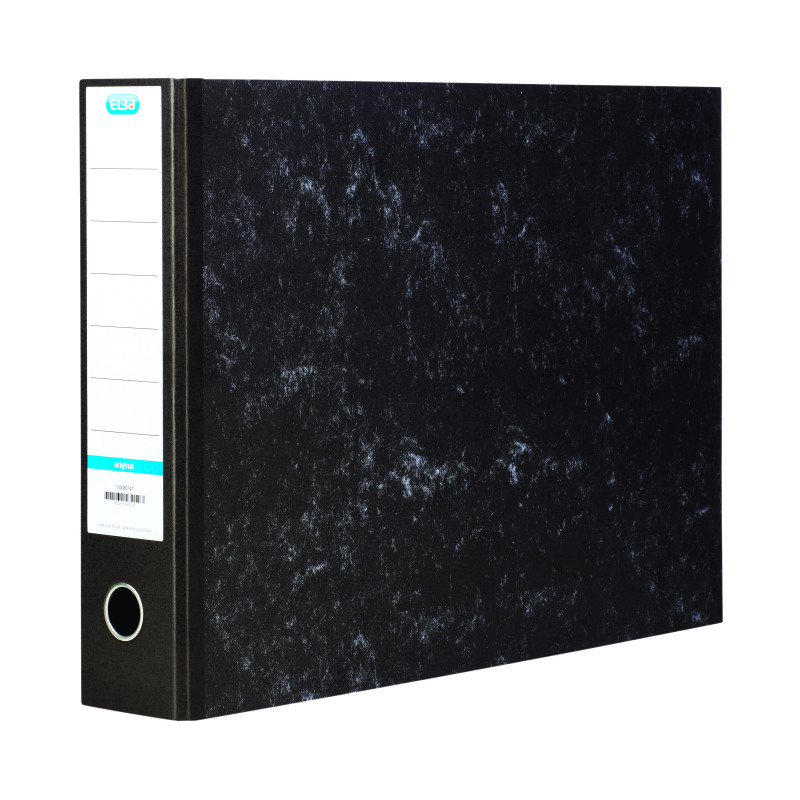 This Elba A3 landscape file features a standard lever arch mechanism with a 70mm capacity. The file is made from high quality board covered with cloud effect paper and features a thumb hole for easy retrieval from a shelf. This black lever arch file also comes with a large spine label for easy identification. This pack contains 1 A3 landscape lever arch file.