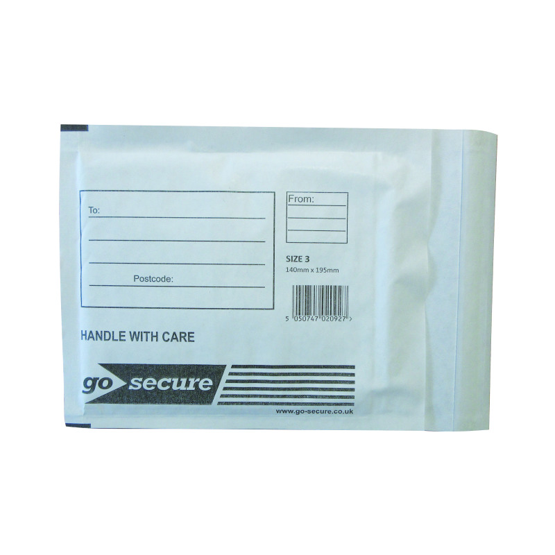 Lightweight and economical, these GoSecure bubble lined envelopes are designed to be impact resistant. With a bubble lined interior and an exterior made from 75gsm MG grade paper, these envelopes are ideal for protecting delicate or fragile items in transit. Featuring a sender address box and a secure peel and seal closure, these size 3 white envelopes measure 140 x 195mm (internal size) and come in a pack of 100. The bubble that inner lines the mailers is produced using a minimum of 30% recycled content.