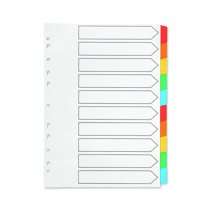 This Q-Connect index divider provides a clear and simple filing solution for your everyday office needs. The front index sheet provides space for labelling to make referencing your notes quick and easy. Made from plain white card with multi-coloured Mylar tabs for extra reinforcement, this index comes in 10 parts and is multi-punched to fit standard lever arch files or ring binders.