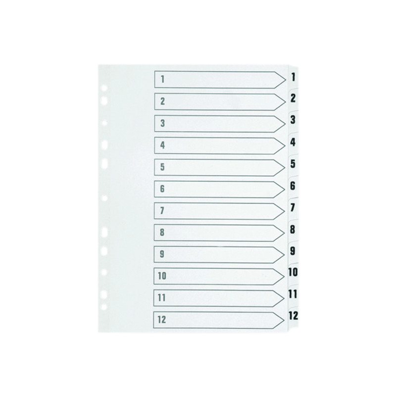 This Q-Connect 1-12 numbered index divider provides a clear and simple filing solution for your everyday office needs. The front index sheet provides space for labelling to make referencing your notes quick and easy. Made from plain white board with clear tabs that are Mylar-coated for extra reinforcement, this index comes with pre-printed tabs (1-12) and is multi-punched to fit standard A4 lever arch files or ring binders.