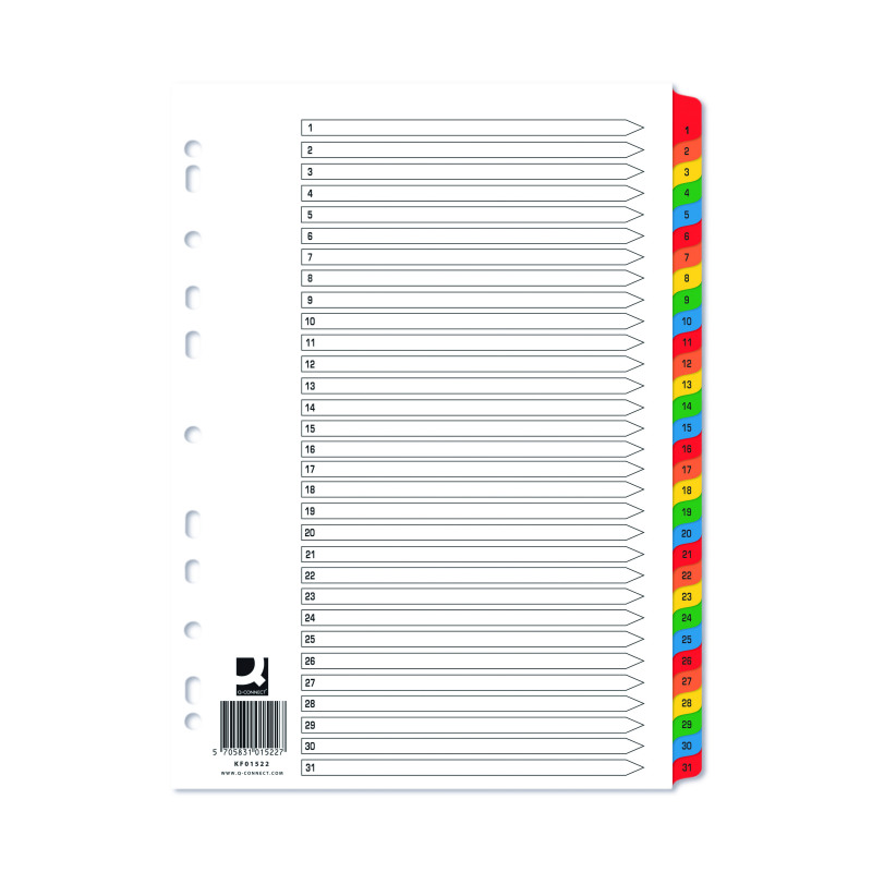This Q-Connect 1-31 numbered index divider provides a clear and simple filing solution for your everyday office needs. The front index sheet provides space for labelling to make referencing your notes quick and easy. Made from plain white card with multi-coloured Mylar tabs for extra reinforcement. This index comes with pre-printed tabs (1-31) and is multi-punched to fit standard lever arch files or ring binders.