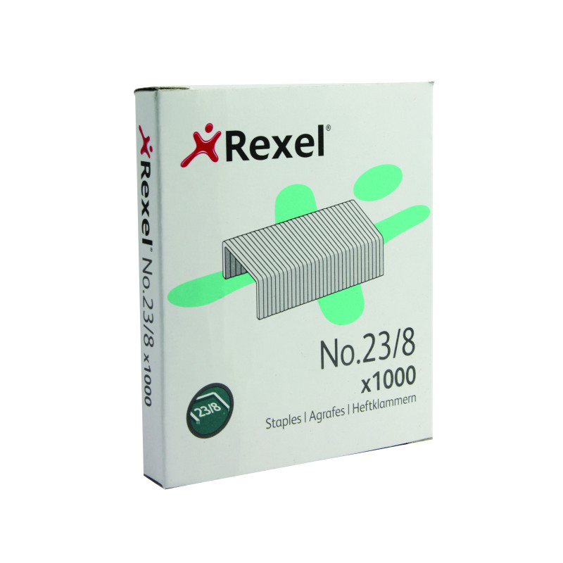 Rexel No. 23 staples are recommended for use with Rexel tackers and heavy duty staplers. With a staple leg length of 8mm and a max width of 13.07mm, these steel staples have a capacity of up to 40 sheets of 80gsm paper. This pack contains 1,000 staples.