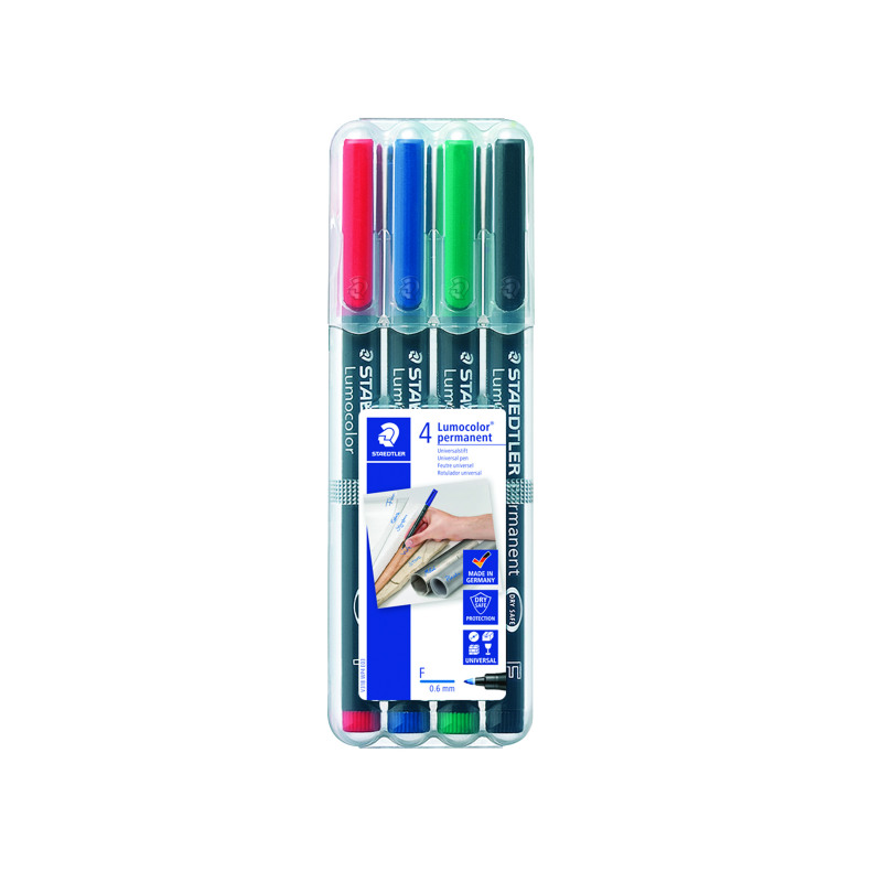 Lumocolor guarantees professional and effective presentation on all overhead transparencies. Not just an OHP pen! - can be used on most other glossy surfaces. Ventilated caps in accordance with ISO 11540. Refillable. Barrel and cap made from PP for long service life and low environmental impact. No toxic heavy metals such as cadmium or lead-based colouring agents are used for the colouring of plastic. STAEDTLER does not use xylene and toluene as ink ingredients. Dry Safe ink increases product life span. Environmentally friendly manufacturing process. Reusable box, phthalate-free material. Fine 0.6mm nib. Black, blue, red and green permanent ink. Packed: 4.