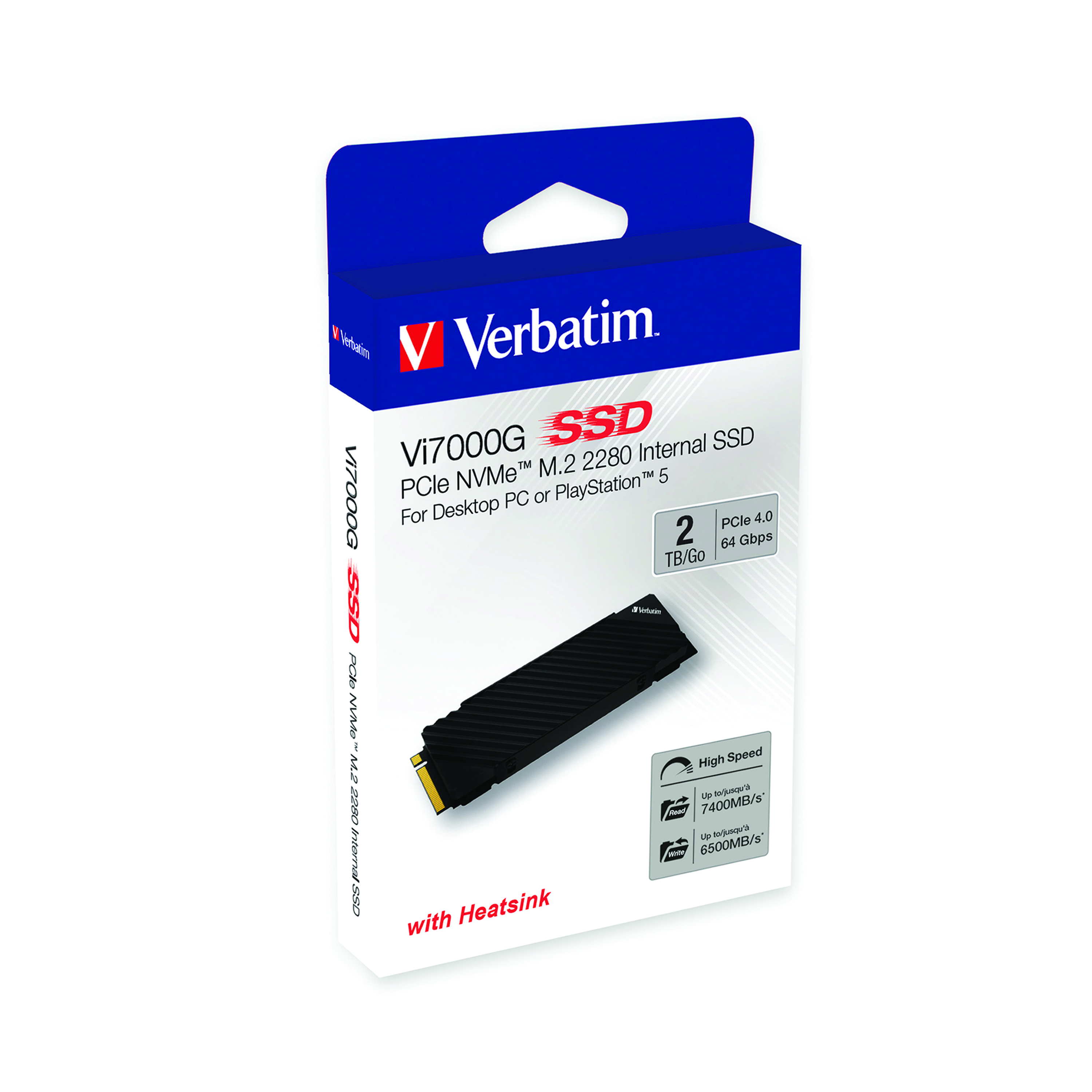 Verbatim's Vi7000 PCIe NVMe M.2 2280 Internal SSDs are designed for users who demand the ultimate in speed and performance. Designed for gamers and high-power users, the Vi7000 is the ultimate upgrade for your gaming rig or console. Being PlayStation 5 compatible, the Vi7000 allows you to store and play PS5 games directly from the drive. Thanks to the PCIe NVMe Gen 4.0 x4 interface, you can enjoy blazing fast data transfer speeds, up to 6x faster than SATA-based SSDs. Transfer multiple or large files with ease with read speeds up to 7000MB/s and write speeds up to 6500MB/s. The small M.2 2280 form factor saves space without sacrificing performance, even with limited chassis or motherboard space. It is equipped with a heat sink and DRAM cache for extreme performance, ensuring that your system always runs at its peak. Verbatim's Vi7000 PCIe NVMe M.2 2280 Internal SSDs are backed by a 2-year limited warranty.